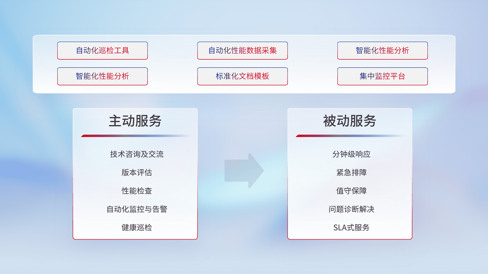 智能化工具和标准化文档,,保障服务质量,,,,提供主动服务(包含技术咨询、、、、版本评估、、、、性能检查、、、自动化监控与告警、、健康巡检)和被动服务包含(分钟级响应、、紧急排障、、、值守保障、、、、问题诊断解决、、SLA服务)。。