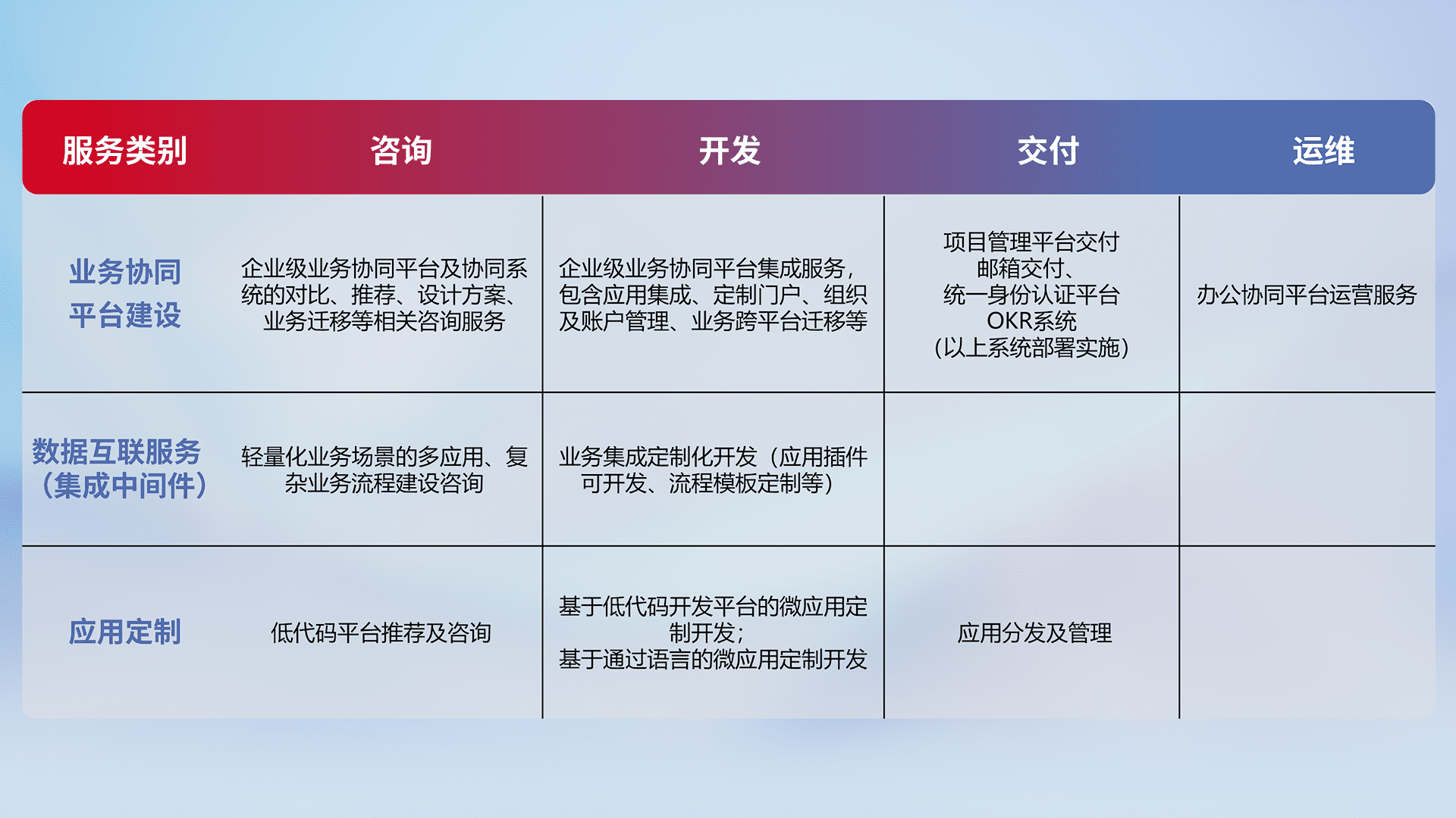 针对钉钉、、、企微、、、、IDaas等平台级产品提供产品的规划、、、、方案、、、、交付、、、、定制化开发等服务,,,,实现如统一协同办公、、智能客户服务、、、、混合会议管理、、、、智能数据查询、、、、等业务场景,,实现数字化转型。。。。